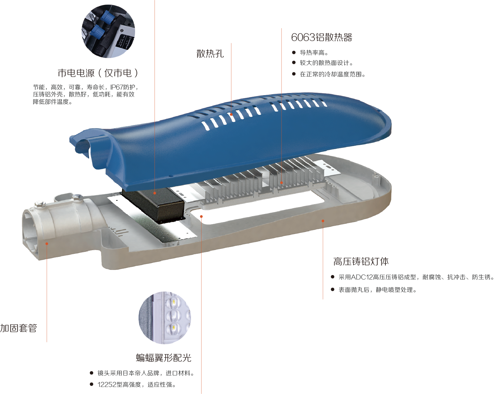 创新透镜,蝙蝠翼型配光,使光线分布更加均匀。