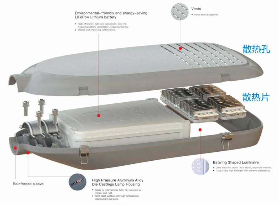 鸿泰太阳能路灯采用导热性极佳的散热片,内腔空间大,热交换面积大,带走更多热量。